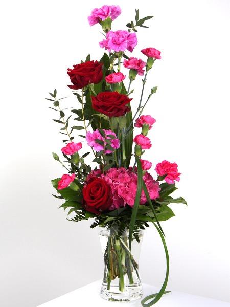 Sidottu eritaso kimppu punaisen ja vaaleanpunaisen sävyissä.